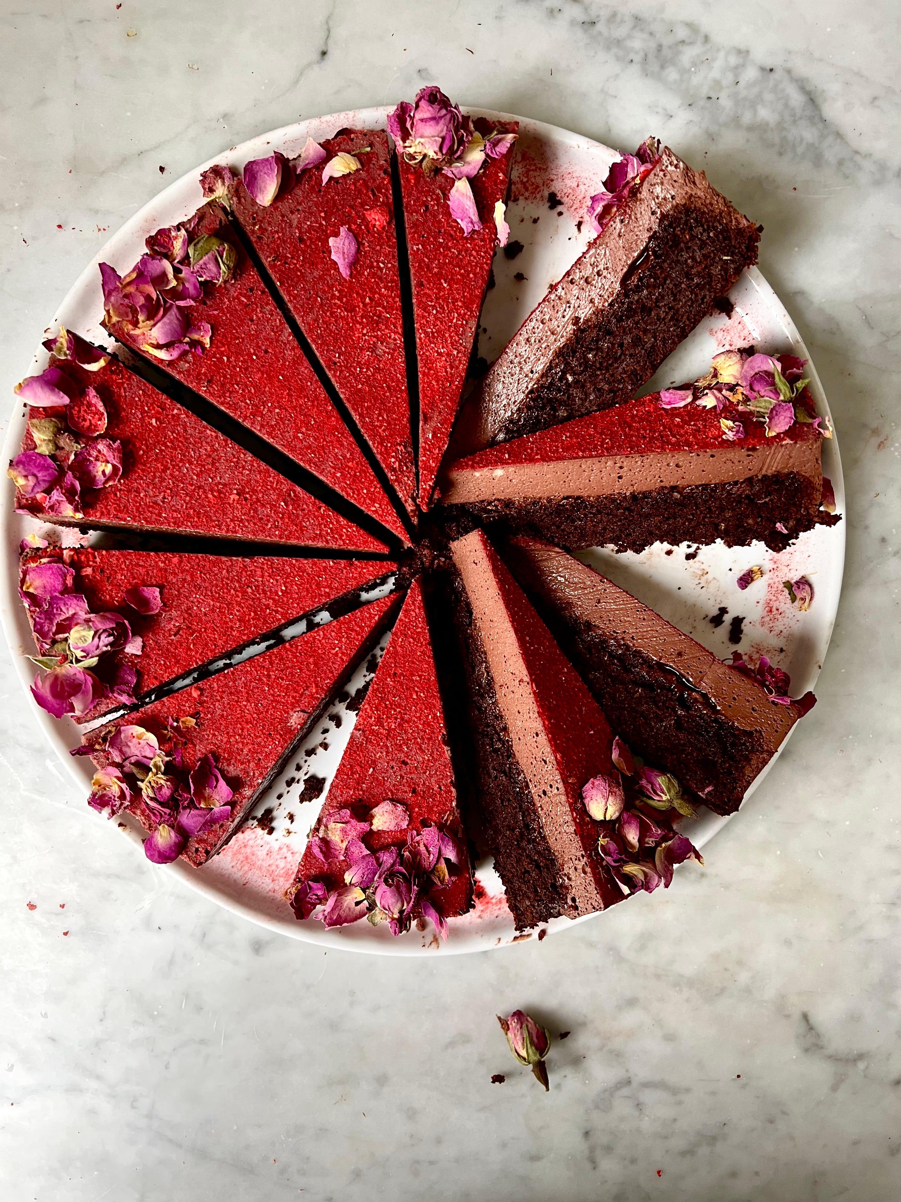 I made it for a friends birthday dinner/valentines party. Couldn’t get quality rose products last minute. Instead I added 1/4 cup Rishi Tea Passionfruit Hibiscus powder (leftover from your previous chocolate cake recipe!) to the mousse, and decorated it with the freeze dried strawberry powder and fresh berries. Will absolutely make again! Thank you for a wonderful cake recipe that everyone loved!