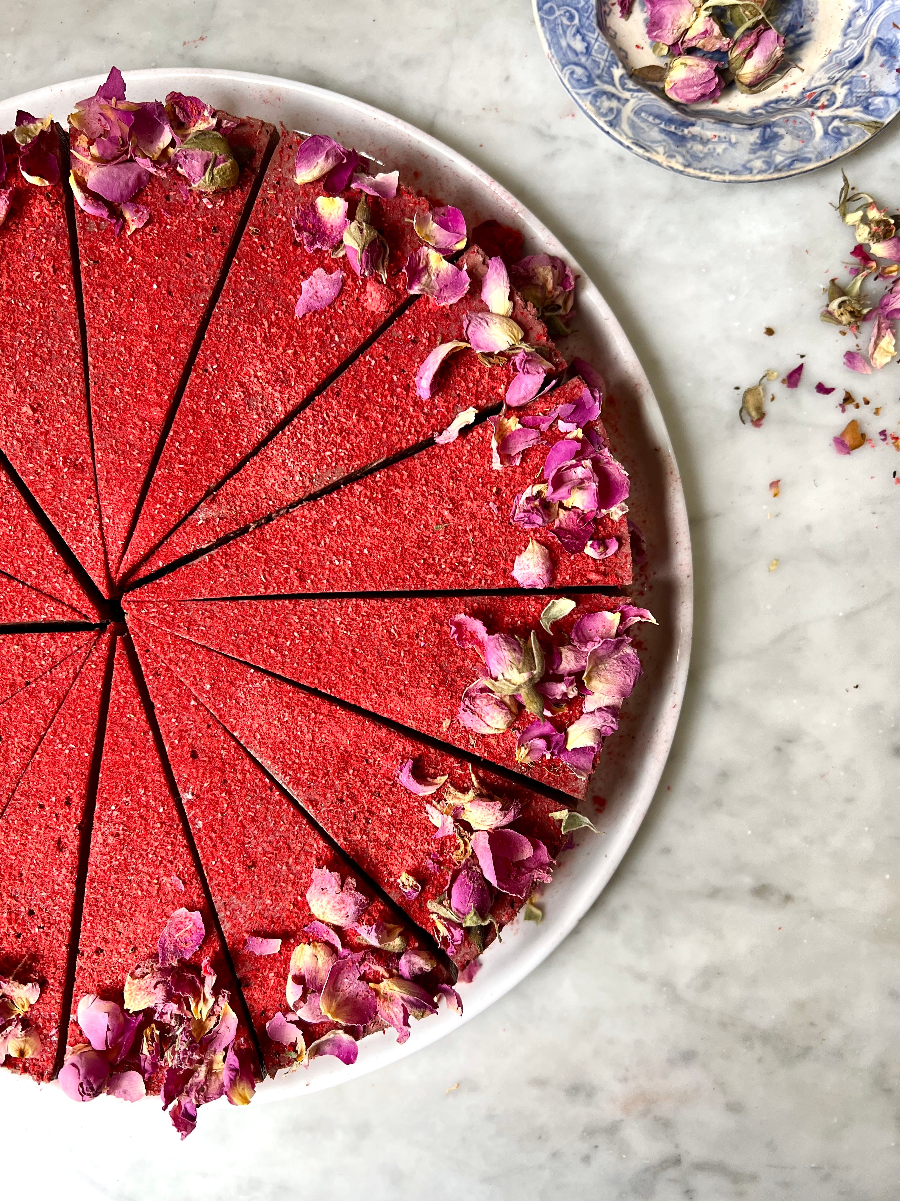 Valentine’s Day—the excuse I’m using to share this deluxe chocolate torte recipe. Really though I just want it to live here so you can access it anytime you need to make something truly special for someone you love. This torte manages to be both elegant and fragrant, also fudgy and chocolaty whilst remaining vegan, gluten free, whole grain and refined sugar free. I created it for Raaka Chocolate using their maple sweetened chocolate, which gives the perfect amount of sweetness and provides an earthiness that plays beautifully with the delicate rose and kiss of strawberry. It’s staggeringly delicious and is seriously mood-elevating—the ideal treat in my opinion.