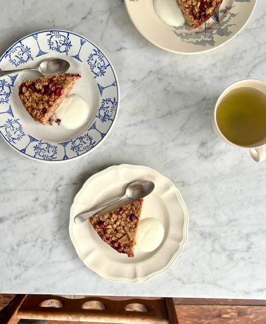 I usually throw the ingredients of this oatmeal into the same pan that I’m cooking it in and its been working well. I do this as I’m prepping dinner and come morning time I’m in deep gratitude to my former self as I only need to heat the oven and slide it in for 30 minutes. Although we prioritize slow mornings with the boys this takes it to a whole new level and we can sip tea, read and snuggle on the couch for a longer stretch. Another addition to the ease and flow of the morning is the fact that it can be eaten warm from the oven, cool if we’re not ready to eat or cold if the book reading goes on and on. Leftovers go into the fridge and are then sliced for a snack—it holds together and travels well.